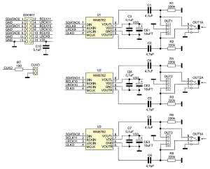 Moduł składa się z trzech identycznych kanałów stereofonicznych. Sygnał wyjściowy z przetwornicka C/A jest doprowadzony do gniazd OUTxA lub do złącz OUTx. Ma on amplitudę 1,2 Vrms przy obciążeniu rezystancją 10 kV. Dla uproszczenia moduł pozbawiono wyjściowych filtrów dolnoprzepustowych. Sygnał jest filtrowany za pomocą filtrów cyfrowych wbudowanych w przetwornik C/A. Kondensatory C1, C2, C5, C6, C8, C9 separują składową stałą z przetwornika C/A.