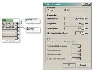 Do zaprogramowania ADAU144x jest konieczny interfejs USBi. Po uruchomieniu środowiska Sigma Studio w obszar roboczy okienka konfiguracji musimy przeciągnąć, połączyć i skonfigurować elementy USBi, ADAU144x oraz E2PROM zgodnie z rysunkiem 4. W zależności od zastosowanej pamięci EEPROM (w modelu 24FC/LC256) jest konieczne określenie wewnętrznej konfiguracji za pomocą zakładki IC2-E2Prom/Properties. Należy podać pojemność pamięci, wielkość bloku danych oraz częstotliwości magistrali I²C (dostępne od Sigma Studio ver. 3.9). W przeciwnym wypadku programowanie EEPROM może być niemożliwe lub nieprawidłowe.