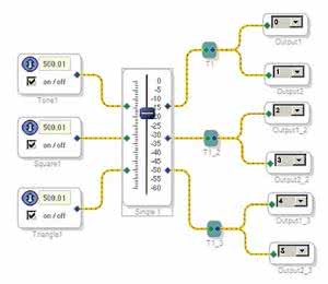 W roli aplikacji testowej wykorzystamy 3-kanałowy generator sygnału o regulowanym poziomie. Schemat blokowy aplikacji pokazano na rysunku 5. W projekcie jest konieczne ustawienie częstotliwości próbkowania na 96 kHz (kwarc 12,288 MHz). Sygnały cyfrowe z generatorów po regulacji poziomu dostępne są w kanałach 0...5 bloku wyjściowego i doprowadzone do wyjściowych kanałów DSP.