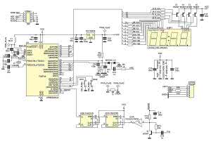 Układ zasilania mikrokontrolera zrealizowano w sposób typowy z użyciem stabilizatora liniowego LM80M05 lub LP2950 (IC3). Do komunikacji z użytkownikiem służy 4-cyfrowy 7-segmentowy wyświetlacz LED (DISP1) o wysokości 14vmm i wspólnej anodzie cyfr, sterowany z multipleksowaniem. Załączanie zasilania anod wyświetlaczy odbywa się za pomocą tranzystorów T2...T5 typu BC807 z uwagi na ograniczony prąd maksymalny pojedynczego portu GPIO mikrokontrolera.
