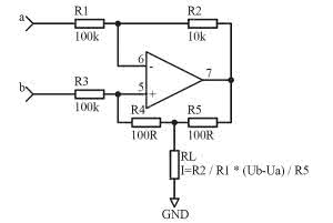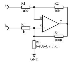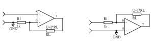Jeśli obciążenie ma być podłączone do masy, można zastosować pokazaną na rysunku 3 pompę prądową Howlanda. Przy dużych wartościach rezystancji obciążenia wzmacniacz operacyjny musi dostarczyć prąd dużo większy, niż płynący przez obciążenie. Wady tej jest pozbawiony nieco zmodyfikowany układ z rysunku 4. Ponadto układ ma dużo większą rezystancję wejściową.