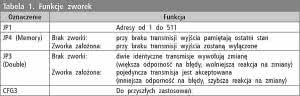 W kolejnym kroku podłączamy urządzenie do sygnału DMX. Za pomocą zworek JP1 ustawiamy adres na urządzeniu wiedząc, że A0 to 20 (1), A1 to 21 (2), ... A8 to 28 (256). Założenie kilku zworek powoduje, że wagi z poszczególnych pozycji zostaną zsumowane. Zakładając zworki JP3 i JP4 można też włączyć akceptowanie pojedynczej transmisji oraz funkcję zapamiętywania ostatniego stanu urządzenia przy braku transmisji. Funkcje zworek umieszczono w tabeli 1.