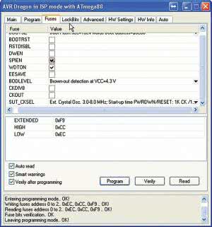 Schemat montażowy demultipleksera DMX pokazano na rysunku 5. Montaż jest typowy i nie wymaga omawiania. Pod mikrokontroler i nadajnik MAX485 warto zastosować podstawki. Uruchomienie najlepiej rozpocząć od pomiaru napięcia zasilającego. Jeśli jest poprawne, umieszczamy mikrokontroler w podstawce. Jeśli nie jest zaprogramowany, można to zrobić za pośrednictwem złącza JP2. Ustawienie bitów konfiguracyjnych pokazano na rysunku 6.