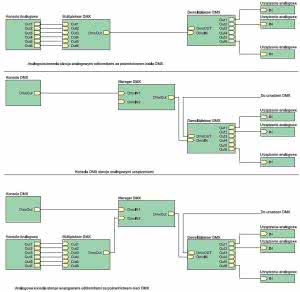 Sygnał DMX doprowadzony do J4 jest konwertowany do poziomu TTL za pomocą układu U4. Złącze JP6 umożliwia włączenie terminatora w linię w sytuacji, gdy demultiplekser jest ostatnim urządzeniem w sieci DMX. Na JP1 ustawiamy adres demultipleksera.