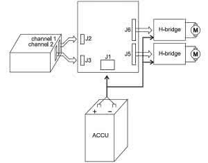Opisany projekt urządzenia służy do sterowania dwoma silnikami prądu stałego za pomocą "impulsów serwomechanizmowych" przesyłanych przez aparaturę do zdalnego sterowania do odbiornika. Silniki są zasilane za pośrednictwem elementów wykonawczych w postaci mostków H.