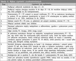 Prawidłowo zmontowany układ można podłączyć do zasilania (jeszcze bez dołączania jakichkolwiek innych wtyków) i przystąpić do konfiguracji bitów zabezpieczających ustalających źródło sygnału zegarowego dla mikrokontrolera. Powinien on pracować z zewnętrznym rezonatorem kwarcowym o częstotliwości 16MHz. Po wgraniu programu układ jest gotów do działania, po wykonaniu kilkuminutowej kalibracji. Jej wykonaniu służą potencjometry montażowe P1-P6, których funkcje opisuje tabela 1. Ponadto, na płytce są również diody LED i zworki - objaśnienia do nich zawarte są w tabelach, odpowiednio, 2 i 3.