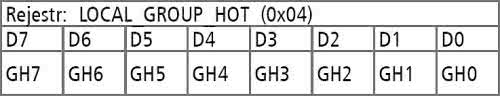 Wartość każdego z bitów rejestru LOCAL_GROUP_HOT określa przynależność modemu PLC do dodatkowo zdefiniowanych grup (o numerach od 7 do 0, odpowiednio dla każdego z bitów rejestru). Na przykład, wpisanie do tego rejestru wartości 0b00010001 spowoduje, iż modem PLC należeć będzie do dodatkowych grup o numerach #5 i #1.