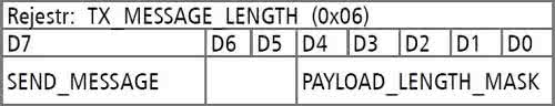 Rejestr TX_MESSAGE_LENGTH określa długość pakietu danych przeznaczonych do wysłania (użytecznych danych użytkownika) → bity D4...D0 oraz inicjuje, poprzez ustawienie bitu SEND_MESSAGE, transmisję danych. Należy mieć na uwadze, iż przed inicjacją transmisji danych należy ustawić wartości wszystkich rejestrów odpowiedzialnych za parametry tejże transmisji jak i wartości samych danych, tj. rejestry: TX_CONFIG, TX_DA, TX_COMMAND_ID i TX_DATA.