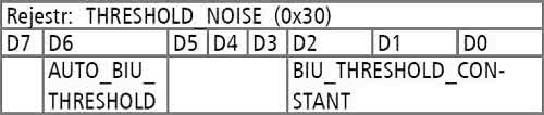Rejestr THRESHOLD_NOISE określa parametry dla mechanizmu detekcji zajętości magistrali danych PLC (detektora BIU). Bity BIU_THRESHOLD_CONSTANT określają predefiniowany poziom sygnału (w dBmVrms), dla którego przyjmuje się, iż magistrala danych jest zajęta przez inne urządzenie PLC. Wartość domyślna (0x03) odpowiada ustawieniu 87 dBmVrms. Ustawienie bitu AUTO_BIU_THRESHOLD wymusza automatyczny dobór poziomu sygnału detektora BIU.