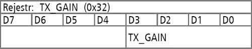 Rejestr TX_GAIN determinuje predefiniowane wzmocnienie sygnału dla wbudowanego w modem PLC nadajnika. Dostępne wartości z przedziału 0x00...0x0E odpowiadają ustawieniom 55 mVp-p...3.5 Vp-p (domyślna wartość 0x0B odpowiada ustawieniu 1.55 Vp-p). Zmiany ustawień tego rejestru niezbędne są w przypadku implementacji dodatkowego, zewnętrznego wzmacniacza sygnału nadajnika jak też dla spełnienia wymagań dotyczących poziomu sygnału transmisji PLC w zakresie odpowiednich norm.