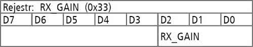Rejestr RX_GAIN determinuje predefiniowane wzmocnienie sygnału dla wbudowanego w modem PLC odbiornika. Dostępne wartości z przedziału 0x00...0x07 odpowiadają ustawieniom 5 mVrms...125 mVrms (domyślna wartość 0x00 odpowiada ustawieniu 5 mVrms). Zmiany ustawień tego rejestru niezbędne są w przypadku implementacji dodatkowego, zewnętrznego wzmacniacza sygnału odbiornika.