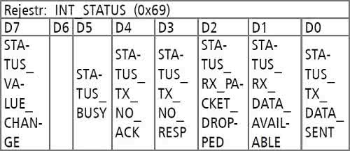 - Bit STATUS_RX_PACKET_DROPPED ustawiany jest w przypadku nadpisania bufora odbiorczego nowymi danymi, gdy dane poprzednie nie zostały jeszcze odczytane.