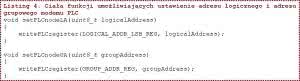 Kolejne, dwie, bardzo krótkie funkcje narzędziowe, które pokazano na listingu 4 służą do ustawienia adresu logicznego modemu PLC jak i adresu grupy, do której przyporządkowujemy nasze urządzenie.