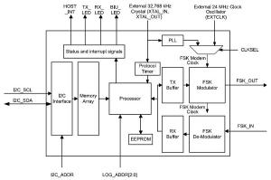 W części odbiorczej mamy do czynienia z dużo bardziej rozbudowanym układem. Zmodulowany, sieciowy sygnał wejściowy (pin FSK_IN) jest wprowadzany do wewnętrznego filtru pasmowoprzepustowego, który zawęża pasmo sygnału użytecznego do 125 kHz...140 kHz, po czym ten sygnał "zasila" demodulator zbudowany z prostego miksera, lokalnego generatora częstotliwości wzorcowej, filtra częstotliwości pośredniej i korelatora.