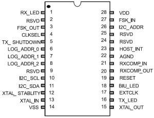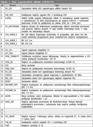 Sygnał z wyjścia tego filtra przechodzi jeszcze przez układ komparatora z histerezą, który służy eliminowania potencjalnych zakłóceń i korygowania opóźnienia wnoszonego przez korelator. Wyjście z komparatora "zasila" rejestr przesuwny, który zamienia strumień szeregowy na wyjściowe pakiety danych poddawane następnie analizie przez mechanizmy warstwy sieciowej stosu komunikacyjnego. Rozmieszczenie wyprowadzeń układu CY8CPLC10 pokazano na rysunku 3 zaś ich opis funkcjonalny umieszczono w tabeli 1.