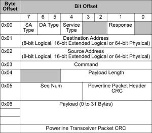- Bajt Powerline Transceiver Packet CRC zawiera sumę kontrolną CRC8 całego pakietu danych, w tym nagłówka i danych użytecznych (wykorzystywaną przez mechanizmy stosu komunikacyjnego).