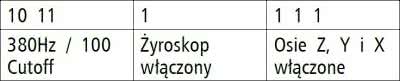 Możliwe kombinacje bitów DR1..BW0 wymienione zostały w kolejnej tabeli w dokumentacji. Zgodnie z tymi informacjami, aby włączyć żyroskop i ustawić jego częstotliwość pracy należy zapisać do rejestru CTRL_REG1_G przykładową wartość: 0b10111111 (0xBF), co oznacza: