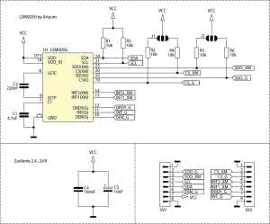 Zmiana poziomów na wyprowadzeniach jest wykonywana poprzez rozwarcie lub zwarcie za pomocą zworek ścieżek łączących rezystory R3...R6 z linią Vcc. Domyślnie układ został przygotowany do pracy poprzez magistralę I²C z adresami 0x6B (G) i 0x1D (XM).