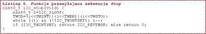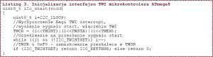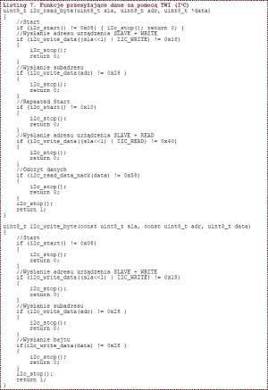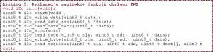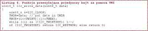 Na listingu 3 pokazano funkcję służącą do inicjalizacji interfejsu TWI. Status TWI zwracany jest w rejestrze TWSR w bitach o numerach 7...3, dlatego pozostałe 3 bity (2...0) zostały zamaskowane liczbą 0xF8 (0b11111000). Kody statusów TWI są szczegółowo opisane w dokumentacji CPU. Działanie funkcji przesyłającej 1 bajt danych (listing 4) polega na zapisaniu bajtu w rejestrze TWDR, a następnie włączeniu interfejsu sprzętowego.