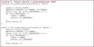 Kolejne funkcje służące do transmisji danych wykonano na podstawie dokumentacji układu LSM9DS0 oraz ATmega8. Pokazano jest na listingu 7. Odczyt rozpoczyna się od wysłania na poprzez interfejs TWI (I²C) adresu urządzenia slave (sla) wraz z ustawioną flagą Write. Po tej operacji układ slave oczekuje na otrzymanie od master kolejnego bajtu, tym razem z adresem komórki pamięci do odczytu (adr).