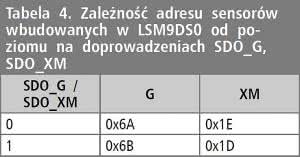 Każde urządzenie typu slave dołączone do I²C musi mieć unikalny adres. Układ LSM9DS0 funkcjonalnie podzielono na dwa urządzenia. Pierwsze z nich udostępnia dane z żyroskopu i oznaczono G. Drugie - oznaczone XM - dostarcza dane z akcelerometru oraz magnetometru. Producent przewidział możliwość zmiany domyślnych adresów. Można to zrobić za pomocą odpowiednich poziomów na wejściach SDO_G i SDO_XM. W tabeli 4 podano adresy interfejsów sensorów wbudowanych w strukturę LSM9DS0.