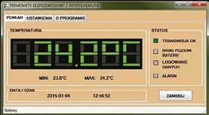 Poniżej wyświetlane są wartości minimalne i maksymalne temperatury, które zostały zarejestrowane podczas działania programu (układ nadajnika nie buforuje takich danych). W polu DATA/CZAS jest wyświetlany tzw. stempel czasowy ramki danych, czyli ostatnia data i godzina odbioru poprawnej wartości temperatury. W polu STATUS znajduje się sygnalizacja kilku funkcji programu: