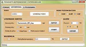 Na komputerze PC uruchamiamy program TERMOMETR_RF_USB_v106.exe. Wybieramy zakładkę USTAWIENIA i w bloku PORT znajdujemy na liście numer portu przydzielonego do naszego odbiornika sygnału radiowego. Naciskamy przycisk OTWÓRZ PORT.