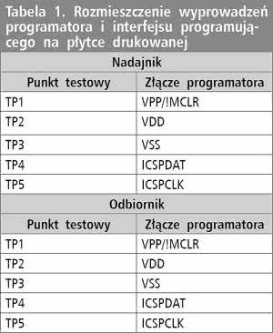 Po poprawnym montażu należy przejść do zaprogramowania mikrokontrolerów. W tabeli 1 opisano rozmieszczenie wyprowadzeń programatora w odniesieniu do punktów testowych na obu płytkach. Jest on taki sam dla nadajnika i odbiornika. Odbiornik należy zaprogramować przy użyciu pliku Termometr_RF_USB_odb_114. hex.