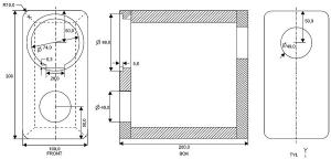 Płytka współpracuje z zestawami głośnikowymi opartymi na głośnikach szerokopasmowych FR89EX firmy Fountek. Obudowy głośników posiadają otwór bass-refleks wykorzystujący typową rurę BR35 o długości 165 mm (przed strojeniem). Wymiary obudów pokazano na rysunku 4. Wykonane są z MDF o grubości 18 mm, sposób wykończenia powierzchni zależy od użytkownika. Model ma zaokrąglenia krawędzi, fornirowane boki oraz malowany lakierem fortepianowym front.