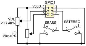 Zmiana nastaw ADAU jest możliwa poprzez sygnały sterujące MP2, MP3, MP8 i MP9 wyprowadzone na złącze GPIO. Rezystor RP3 jest opcjonalny i nie należy go montować w tej wersji oprogramowania DSP. Wszystkie obwody zasilania PLL i rdzenia DSP są filtrowane przez zestawy koralik ferrytowy + kondensator.