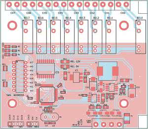 Wyboru napięcia pracy dla całego zespołu przekaźników (VREL) dokonujemy wlutowując rezystor o wartości 0 V: albo w miejsce R11 dla przekaźników na 12 V, albo w miejsce R12, gdy zastosujemy przekaźniki na 5 V. Napięcie VREL jest podawane bezpośrednio na cewki przekaźników oraz do wewnętrznych diod zabezpieczających w popularnym układzie 8-kanałowego drivera ULN2803A (IC5).