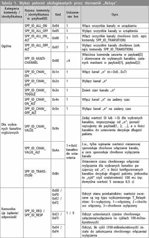 W tabeli 1 umieszczono skrócony opis obsługiwanych poleceń SPPoB. Część poleceń zachowuje taką samą składnię, jaka była zastosowana dla sterownika "PWMLEDz", aby zapewnić możliwie dobry stopień kompatybilności obu tych urządzeń. Przykładowo, sterownik "Relayz" obsługuje polecenie wpisywania arbitralnej wartości do jednego bądź wielu kanałów SPP_ID_CHAN_VALUE podobnie jak "PWMLEDz", lecz potrafi on rozróżnić jedynie podane wartości zerowe (wyłącz kanał) i niezerowe (włącz kanał).