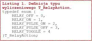 przyjmująca jako pierwszy argument numer przekaźnika (od 0 do 7), którego stan chcemy zmodyfikować oraz, w drugim argumencie, akcję, jaką chcemy wykonać. Akcje zakodowane są we wspomnianym wcześniej (list. 1) typie wyliczeniowym T_RelayAction.