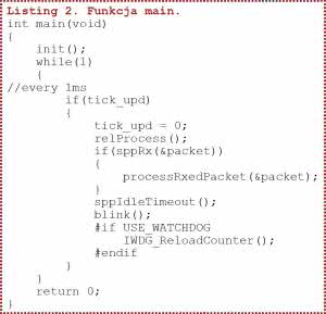 Podstawowe parametry SPPoB możemy zmodyfikować typowo, jak we wcześniej opisywanych urządzeniach SPPoB, czyli edytując plik spp_cfg.h umieszczony w katalogu głównym projektu. Większość kodu specyficznego dla sterownika "Relayz" znajduje się w funkcji main (listing 2) oraz modułach programowych z podkatalogu drivers. W głównej pętli programowej cały kod wykonywany jest co ok. 1 ms, czyli za każdym razem, kiedy ustawiona będzie flaga tick_upd. Flaga ta jest ustawiana w funkcji obsługi przerwania SysTick_Handler.