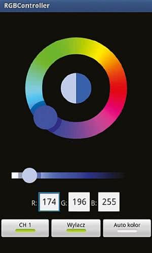 Wygląd aplikacji pokazano na rysunku 3. W górnej części umieszczono okrąg zawierający kolory z palety RGB. W celu wybrania koloru należy dotknąć wskaźnik i po prostu przesunąć go na pożądaną barwę. Dodatkowo możemy zmodyfikować jej odcień za pomocą leżącego poniżej paska regulującego nasycenie koloru oraz jego jasność (Saturation/Value Bar). Przesuwając go w lewo rozjaśniamy wybrany kolor aż do całkowitej bieli 0xFFFFFF, natomiast przesuwając w prawo przyciemniamy aż do czerni (0x000000). Nastawy są natychmiast przesyłane do mikrokontrolera, dzięki czemu zmiana koloru świecenia diod RGB jest wykonywana w czasie rzeczywistym.