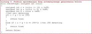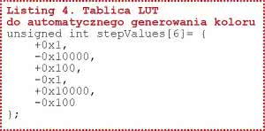 Zmianę koloru w najprostszym wypadku można by uzyskać dzięki zwykłej inkrementacji. Przy takiej metodzie dałoby się uzyskać wszystkie możliwe kolory, lecz nie zmieniałyby się one płynnie (np. jasny niebieski 0x0000ff a następnie skok do bardzo ciemnego zielonego 0x000100). Z tego powodu należy płynnie odejmować jasność z jednego koloru, a po dojściu do zera dodawać do innego, aż do osiągnięcia 0xFF. Aby rozróżnić poszczególne etapy napisałem funkcję checkStage (listing 3) wykrywającą sytuację, w której jeden lub dwa kolory są wygaszone. Jeśli funkcja zwróci prawdę, to inkrementujemy indeks stepValues (listing 4) do tablicy LUT, w której są zdefiniowane wartości, jakie mają być dodane lub odjęte od liczby definiującej kolor.