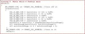 Sposób działania pętli while pokazano na listingu 5. Dla zagwarantowania prawidłowej zmiany koloru fragment kodu odpowiedzialny za przeliczanie koloru jest wykonywany przy wyłączonej obsłudze przerwań od UART. Pozostały czas procesora jest zużywany w funkcji delay, która sprawdza w pętli flagi błędów od UART i po wykryciu aktywnej flagi wysyła informację do terminala.