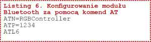 W tym celu wpisujemy komendy AT zamieszczone na listingu 6 kończąc każdą linijkę przyciśnięciem Enter (w razie problemów należy sprawdzić, jaki znak jest domyślnie wysyłany jako znak końca linii przez terminal). Pierwsza komenda zmieni nazwę urządzenia, druga zmieni numer PIN, natomiast trzecia ustawi prędkość transmisji na 230400 kbs. Do ponownej komunikacji z modułem niezbędna będzie oczywiście zmiana prędkości w konfiguracji terminala.