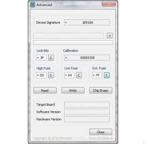 Programowanie mikrokontrolera odbywa się przez złącze JP4. Wyprowadzenie linii sygnałowych na złączu zostało opisane poniżej tego złącza. Przy programowaniu należy pamiętać o odpowiedniej konfiguracji bitów opcji. Należy je ustawić w taki sposób, aby źródłem sygnału zegarowego mikrokontrolera był sygnał z wewnętrznego oscylatora 8 MHz podzielony przez 8 (rysunek 3).
