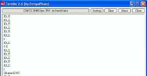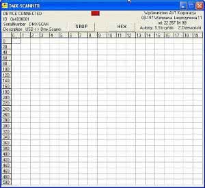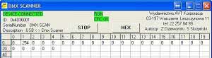 Obsługa skanera z poziomu terminala nie jest wygodna, dlatego powstał program DMX Skaner v1, którego okno pokazano na rysunku 6. Program automatycznie wykrywa skaner dołączony do komputera. Na górnej belce znajduje się szereg informacji.