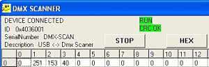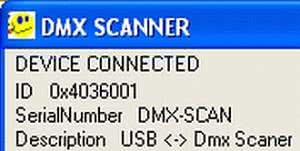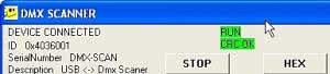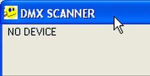 Jeśli program wykryje skaner, zobaczymy komunikat jak na rysunku 7, natomiast w przeciwnym wypadku jak na rysunku 8. Jeśli skaner jest połączony z komputerem, ale nie ma transmisji DMX, w statusie skanera ukazuje się napis IDLE (rys. 6). Gdy pojawi się transmisja DMX, status zmieni się na RUN (rysunek 9).