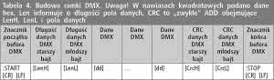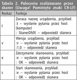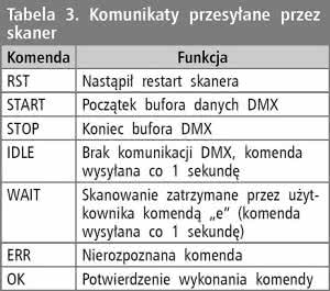Polecenia realizowane przez skaner wymieniono w tabeli 2. Skaner przesyła za pomocą interfejsu USB krótkie komunikaty tekstowe, które mogą być interpretowane przez oprogramowanie lub obsługę - wymieniono je w tabeli 3. W tabeli 4 umieszczono opis ramki DMX, natomiast niżej przykładową ramkę odebraną za pomocą Mini Konsoli (AVT-5456) i programu terminala: