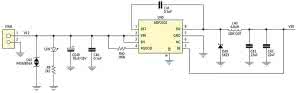 Wejście przetwornicy jest zabezpieczone przed przepięciami diodą D41. Dioda świecąca LD9 sygnalizuje doprowadzenie zasilania. Ze względu na wysoką częstotliwość kluczowania, istotny jest dobór elementów przetwornicy. Filtr wejściowy wykonano z użyciem kondensatorów o obniżonym ESR: CE40 (tantalowy) i C40 w obudowie 1812 z dielektrykiem X5R.