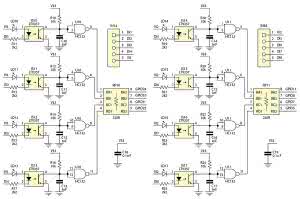 Do monitorowania sygnałów cyfrowych zastosowano typowy układ separacji opartej o transoptor, filtr RC i bramkę Schmidta (rysunek 2). Układ sprzętowo eliminuje krótkie zakłócenia impulsowe ze styków mechanicznych. W szereg z diodą transoptora włączono diodę LED sygnalizującą obecność napięcia.