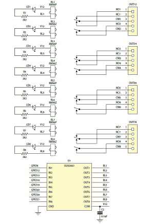 Wyjścia cyfrowe (rysunek 3) zrealizowano w oparciu o przekaźniki. Cztery grupy składające się z przekaźnika zwiernego i przełącznego zapewniają elastyczność połączeń. Cewki przekaźników sterowane są z wyprowadzeń GPIO poprzez bufor U1 (ULN2803) zapewniający odpowiednią wydajność prądową.