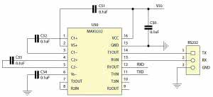Moduł wyposażono w interfejs szeregowy w standardzie RS232 oparty o układ MAX3232. Schemat interfejsu zamieszczono na rysunku 4.