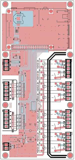 Układ zmontowany jest na dwustronnej płytce drukowanej - jej schemat montażowy pokazano na rysunku 7. Ze względu na specyfikę zastosowań zastosowałem odmienną konstrukcję mechaniczną. Komputerek Raspberry Pi standardowo jest uzupełniany nakładkami rozszerzającymi jego funkcje.