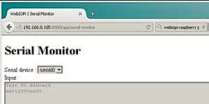 Po przejściu do przeglądarki internetowej pod adres http://localhost:8000/ (użytkownik: webiopi, hasło: raspberry) w linku GPIO-header powinna być widoczna zaktualizowana lista GPIO (rysunek 8) oraz po wybraniu linku Serial Monitor, możliwe jest sprawdzenie działania portu szeregowego rysunek 9.