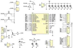Schemat ideowy odbiornika zamieszczono na rysunku 3. Znaczący obszar schematu zajmują połączenia pomiędzy mikrokontrolerem ATmega16L a wyświetlaczem LCD typu JH17 (3,5 cyfry). Wielką zaletą tego wyświetlacza jest możliwość zasilania napięciem 3 V.