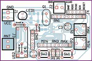 Układ odbiornika został zmontowano na dwustronnej płytce drukowanej, której schemat montażowy pokazano na rysunku 4. Podobnie, jak w przypadku płytki nadajnika, również i tutaj został przewidziany niewielki obszar miedzi na antenę wraz z możliwością jej powiększenia.